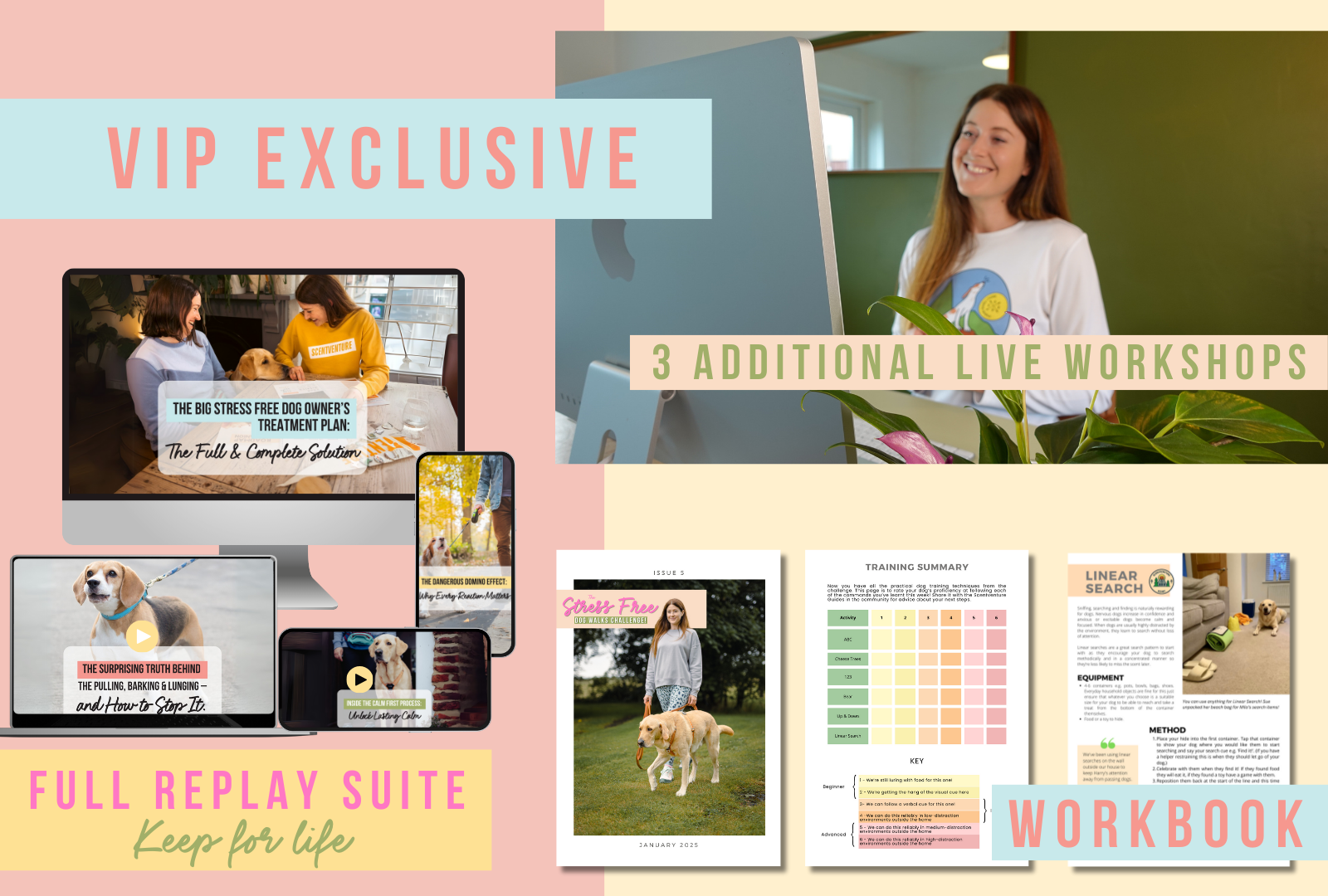 When you’re stressed, your dog is more likely to pull, bark or lunge. But when you’re calm, they can more easily ignore distractions and stay calm too.The happiest, most relaxed dog owners are confident and sure of themselves on walks. They get faster dog training results because they overcome obstacles faster than the average owner - meaning they achieve their goals quicker and with less stress. Over 3 VIP-Exclusive Workshops you’ll gain the mindset skills needed to train your dog with ease, confidence and resilience.